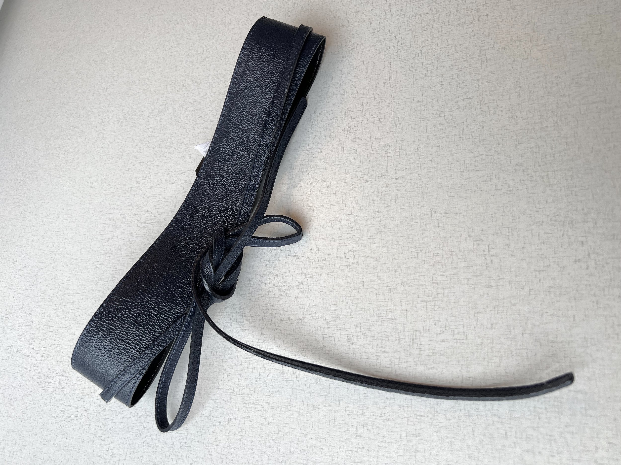 Possui 2 tiras finas fixa nas pontas para transpassar e amarrar ou fazer um laço