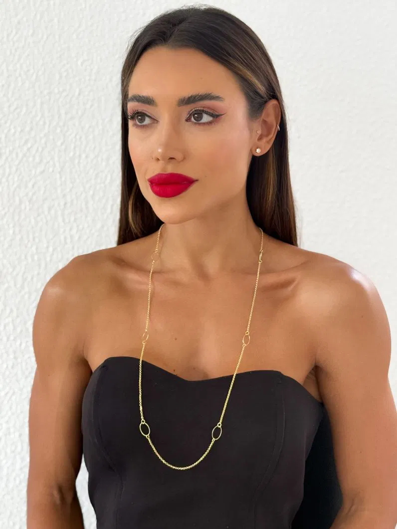 Folheado com acabamento de alta qualidade, o colar possui brilho dourado elegante e acabamento refinado, garantindo um toque sofisticado ao look. O comprimento alongado proporciona um caimento leve e fluido, ideal para composições elegantes e contemporâneas.