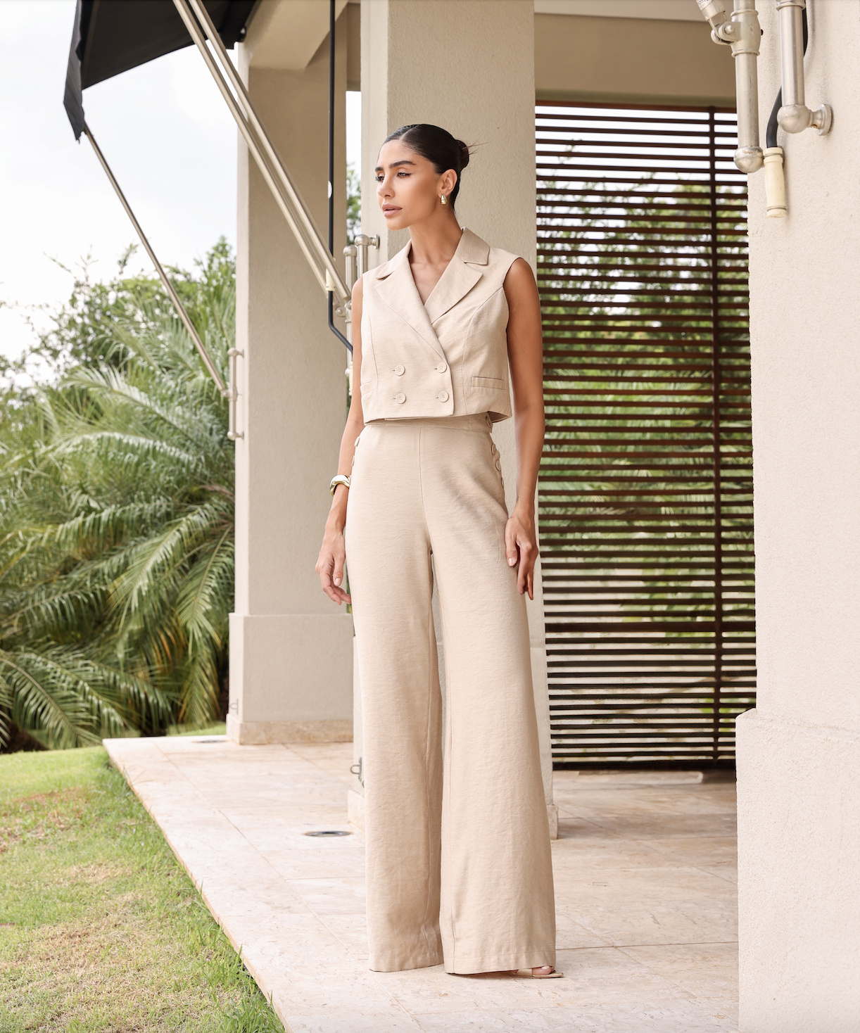 Tecido Premium: Feito em uma mistura de viscose, poliéster e linho, que proporciona leveza, caimento impecável e uma textura única. Colete: Possui um design estruturado com fechamento por botões forrados, conferindo charme e acabamento refinado. Calça Pantalona: A modelagem ampla garante conforto e movimento, criando uma silhueta alongada e fluida.