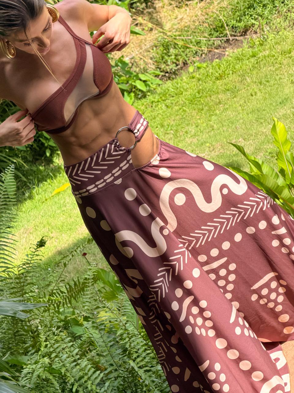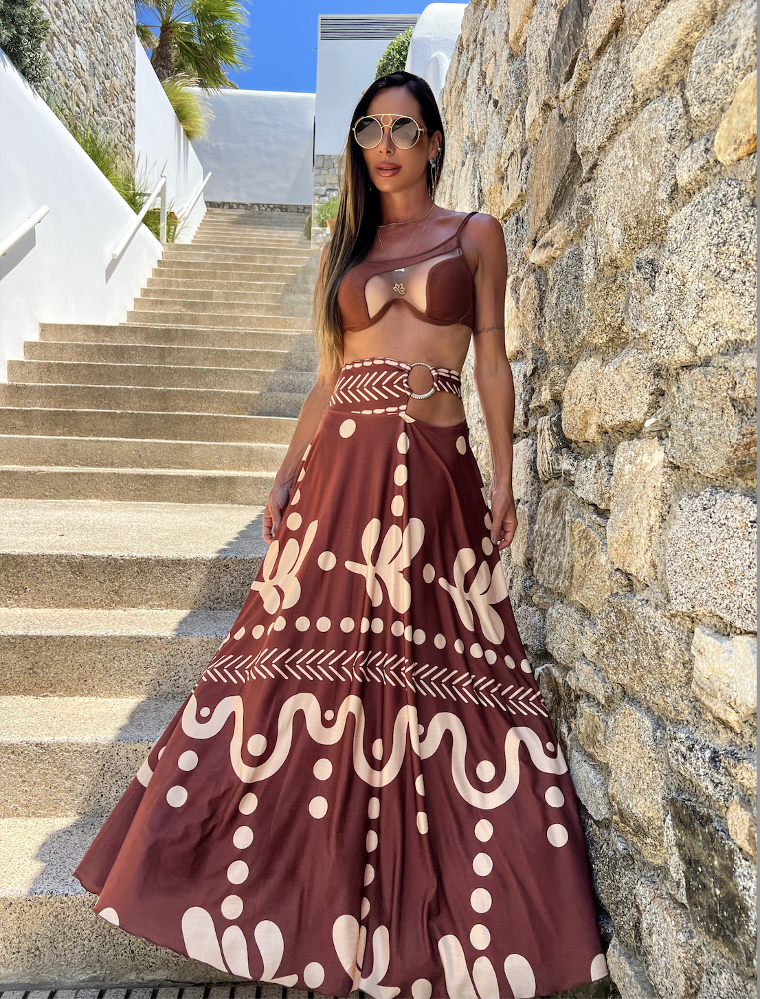 O modelo é compo por uma saia longa com aviamento no tom prata e um conjunto de biquini.