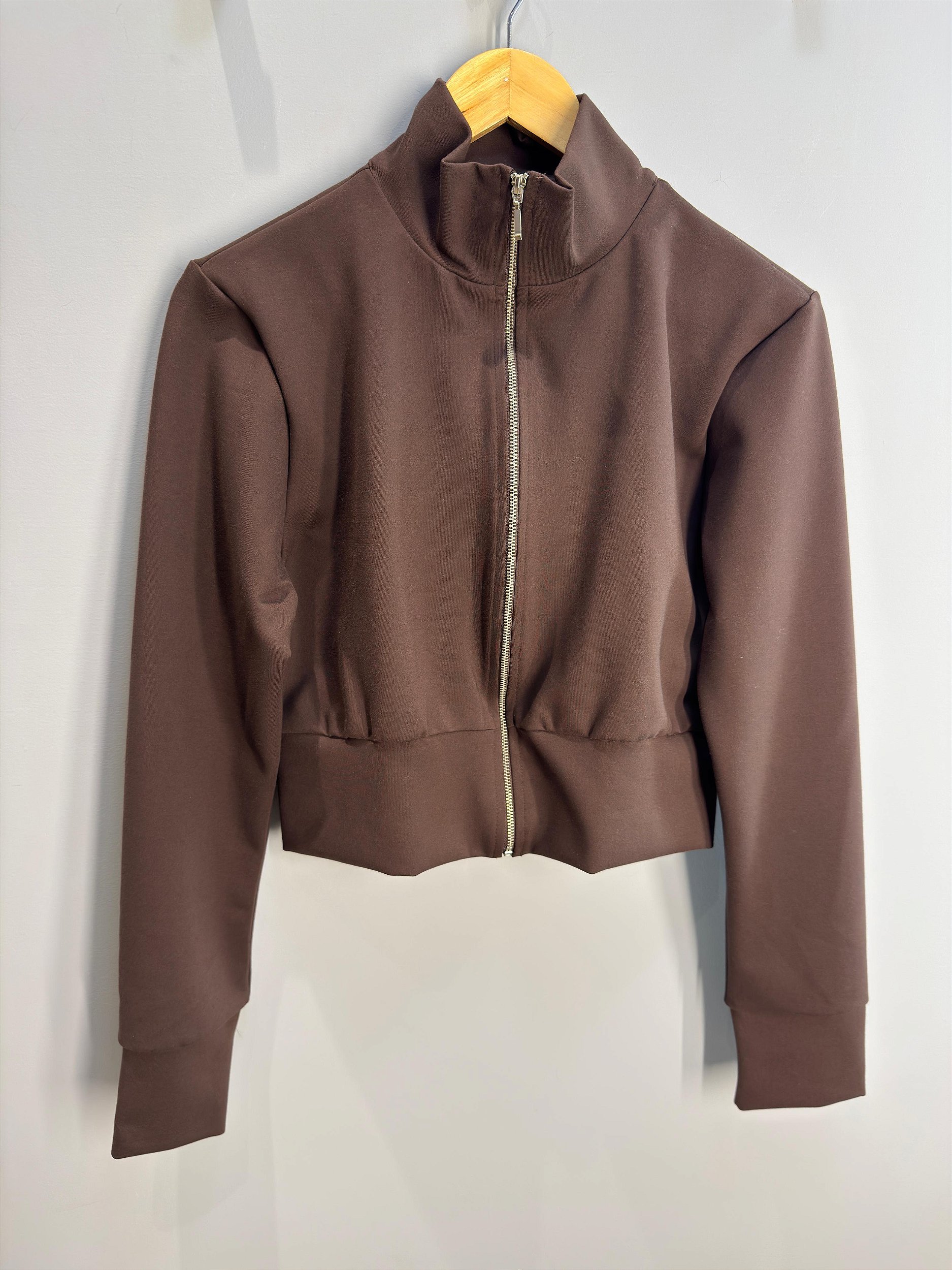 Jaqueta justinha ao corpo, com zíper frontal