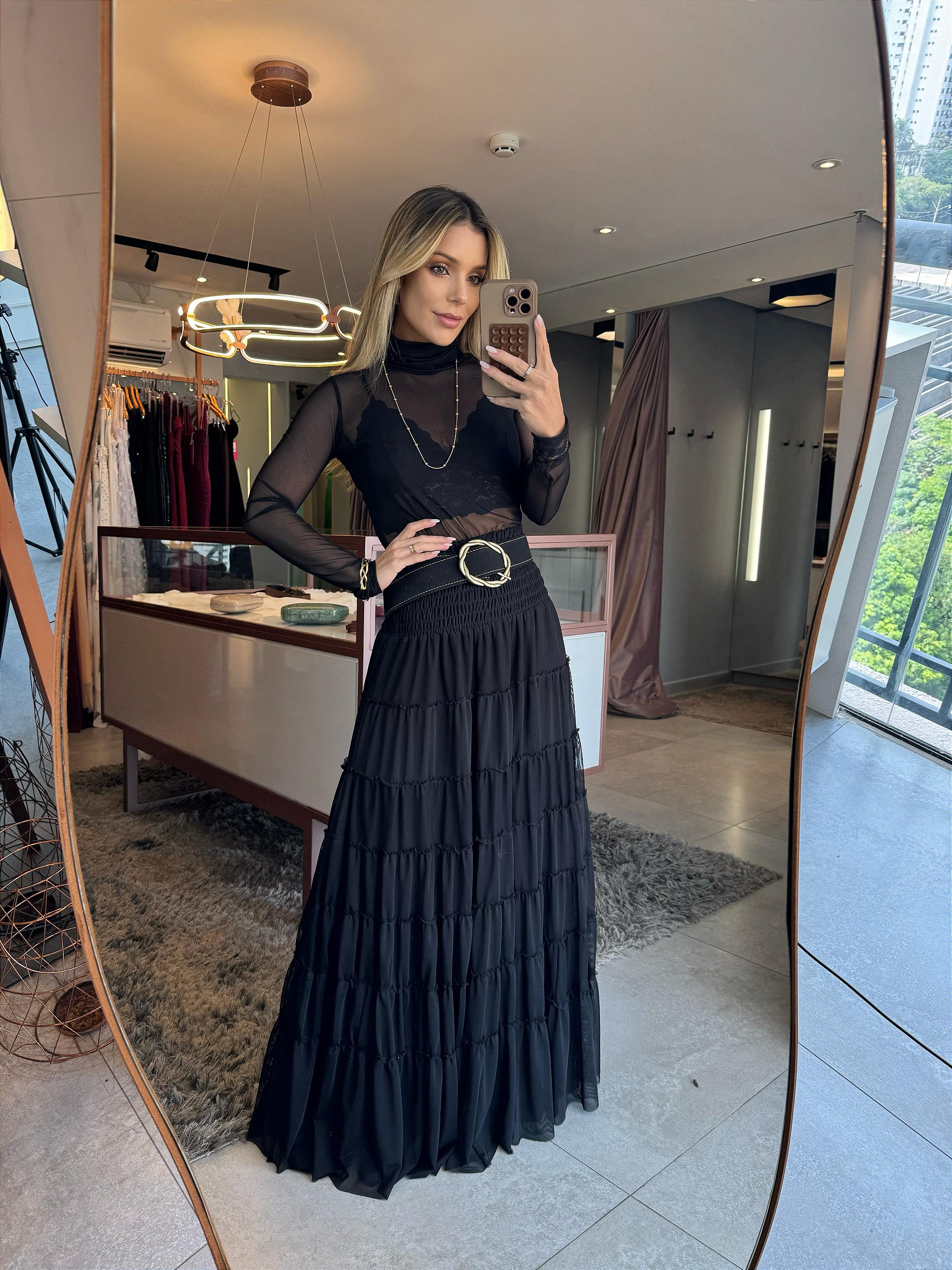 A saia é um modelo longo, cintura alta, confeccionada em microtule, cós em lastex que ajuda a acinturar a peça e afinar a cintura.