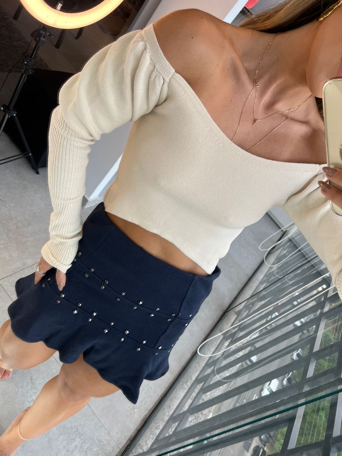 Possui forro Tecido Moletinho Possui detalhes com tachas prata
