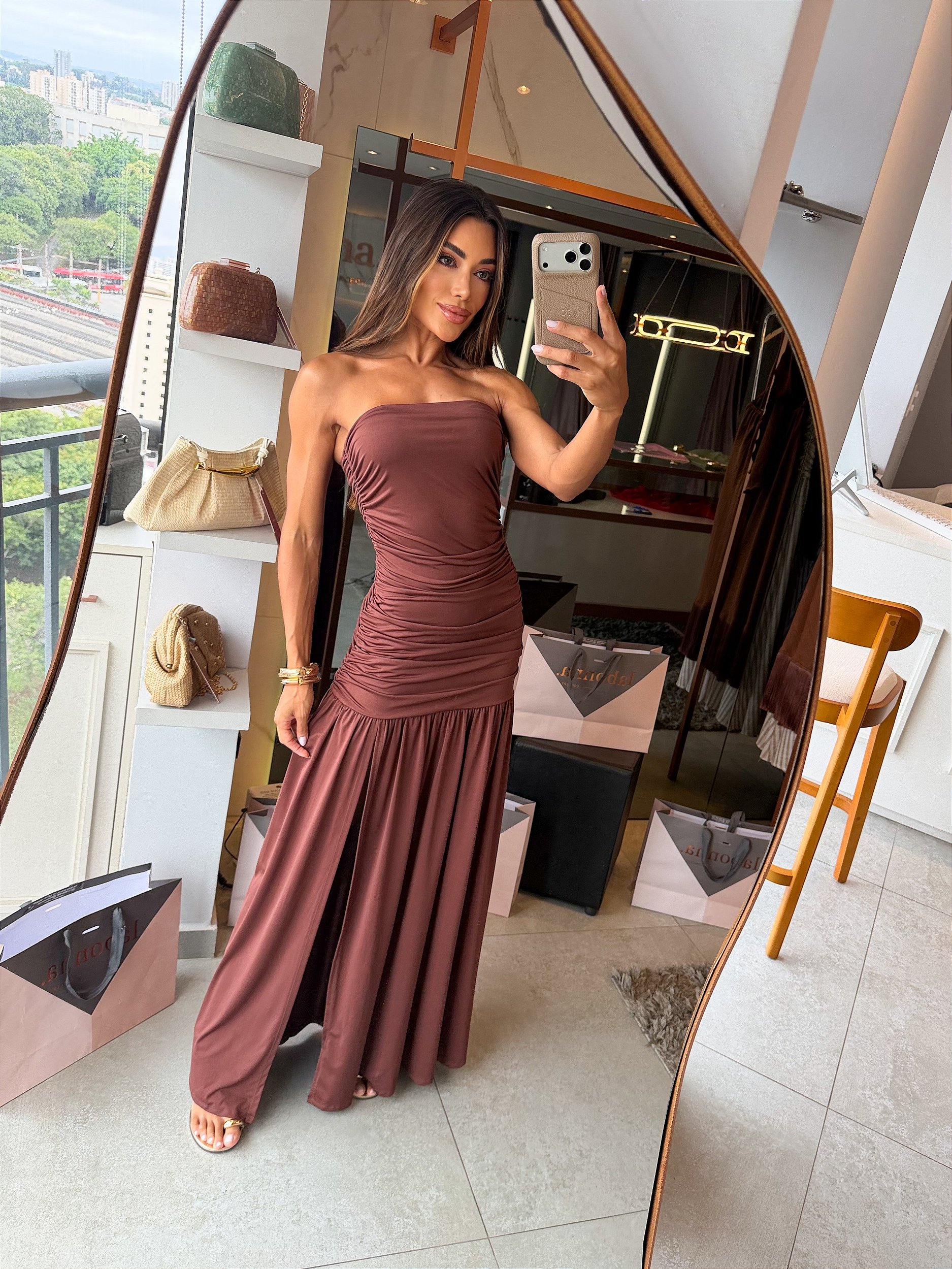 O vestido longo tomara que caia é a definição de sofisticação com um toque moderno. Confeccionado em malha de toque macio e alta elasticidade, ele se ajusta perfeitamente ao corpo, valorizando a silhueta de forma elegante e confortável. O drapeado ao longo do busto e da cintura cria um efeito visual que alonga e modela, enquanto a saia fluida traz movimento e leveza ao look.