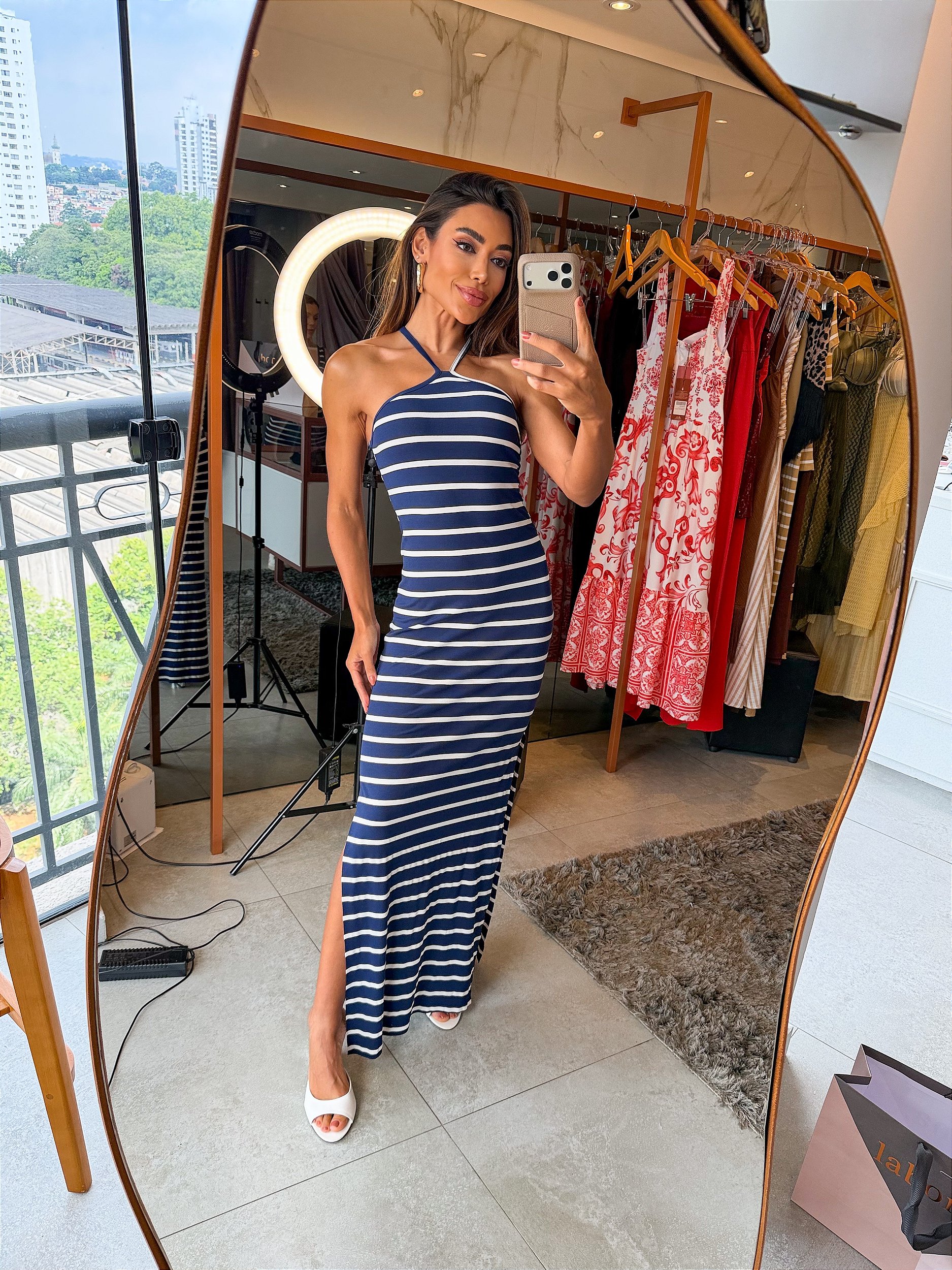 O vestido longo listrado marinho em tecido Stella Maris é a escolha ideal para quem busca elegância, conforto e versatilidade em uma única peça. Com modelagem ajustada ao corpo, valoriza a silhueta feminina de forma sofisticada, sem abrir mão do conforto.