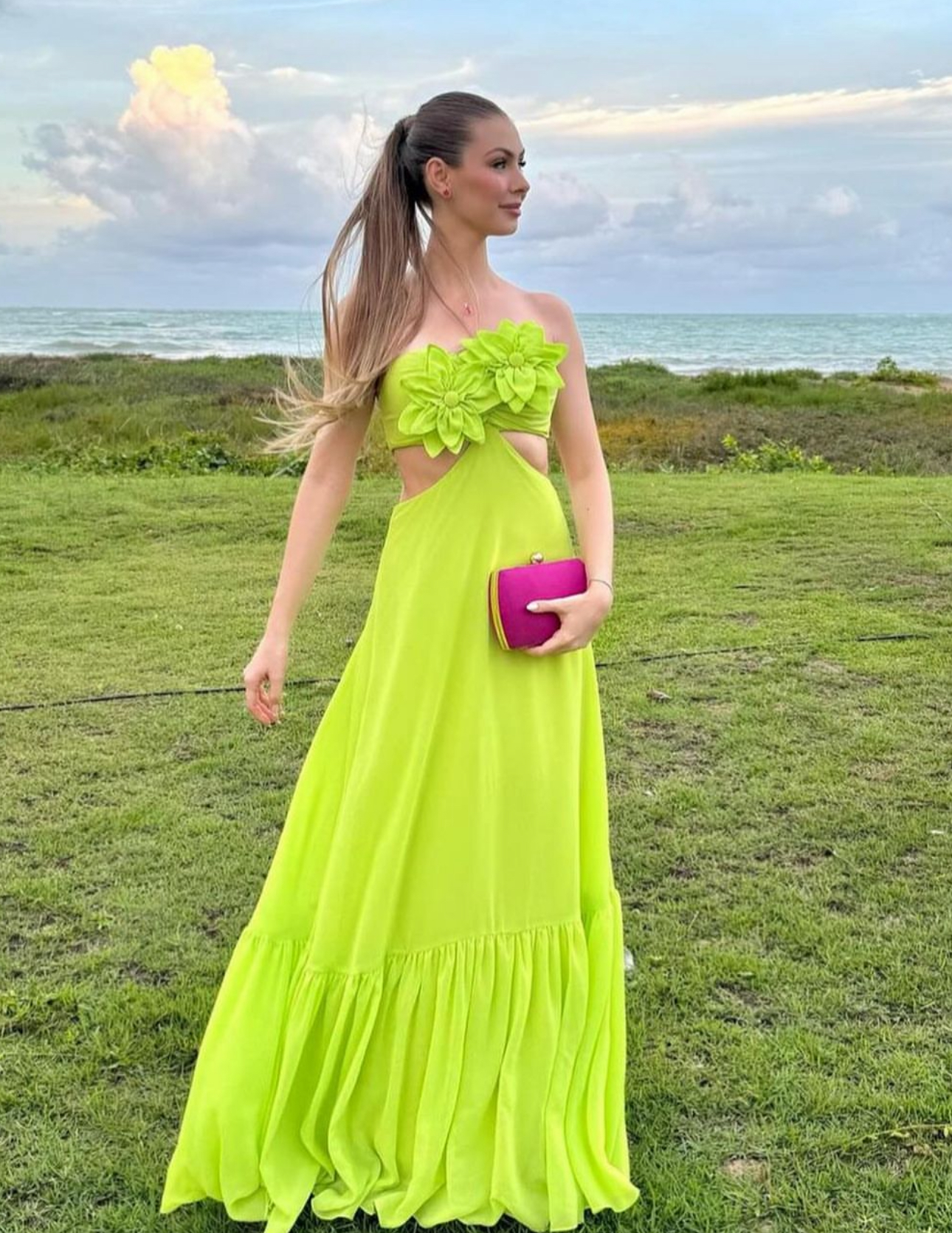 O modelo é um vestido longo com tecido leve e fluido, sua flores podem ser retiradas para uma proposta mais clean.