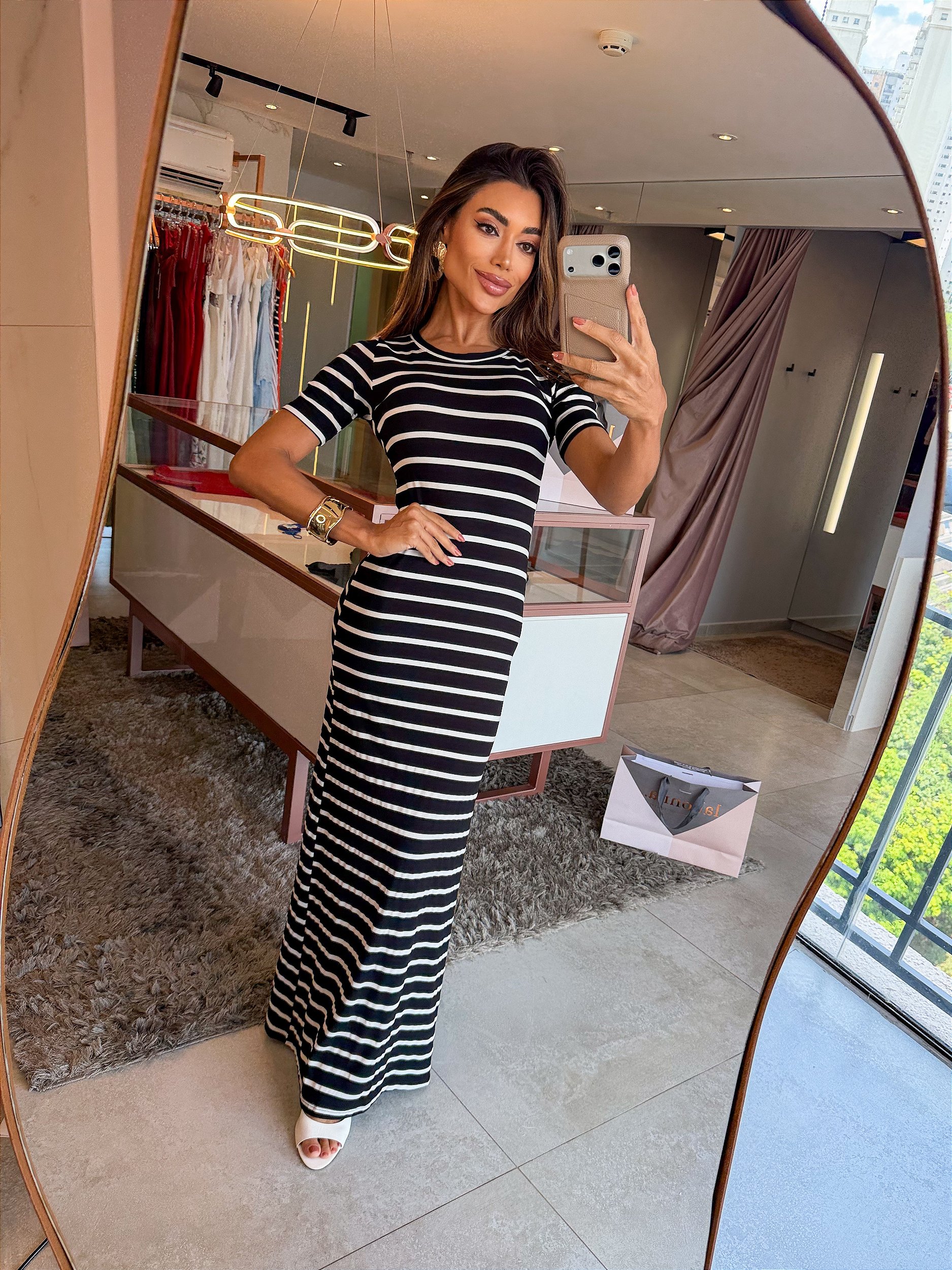 Com modelagem reta levemente ajustada, comprimento longo e mangas curtas, o vestido apresenta decote arredondado clássico e padronagem de listras horizontais que trazem um visual atemporal e moderno. Ideal para composições elegantes tanto para o dia quanto para ocasiões casuais especiais.