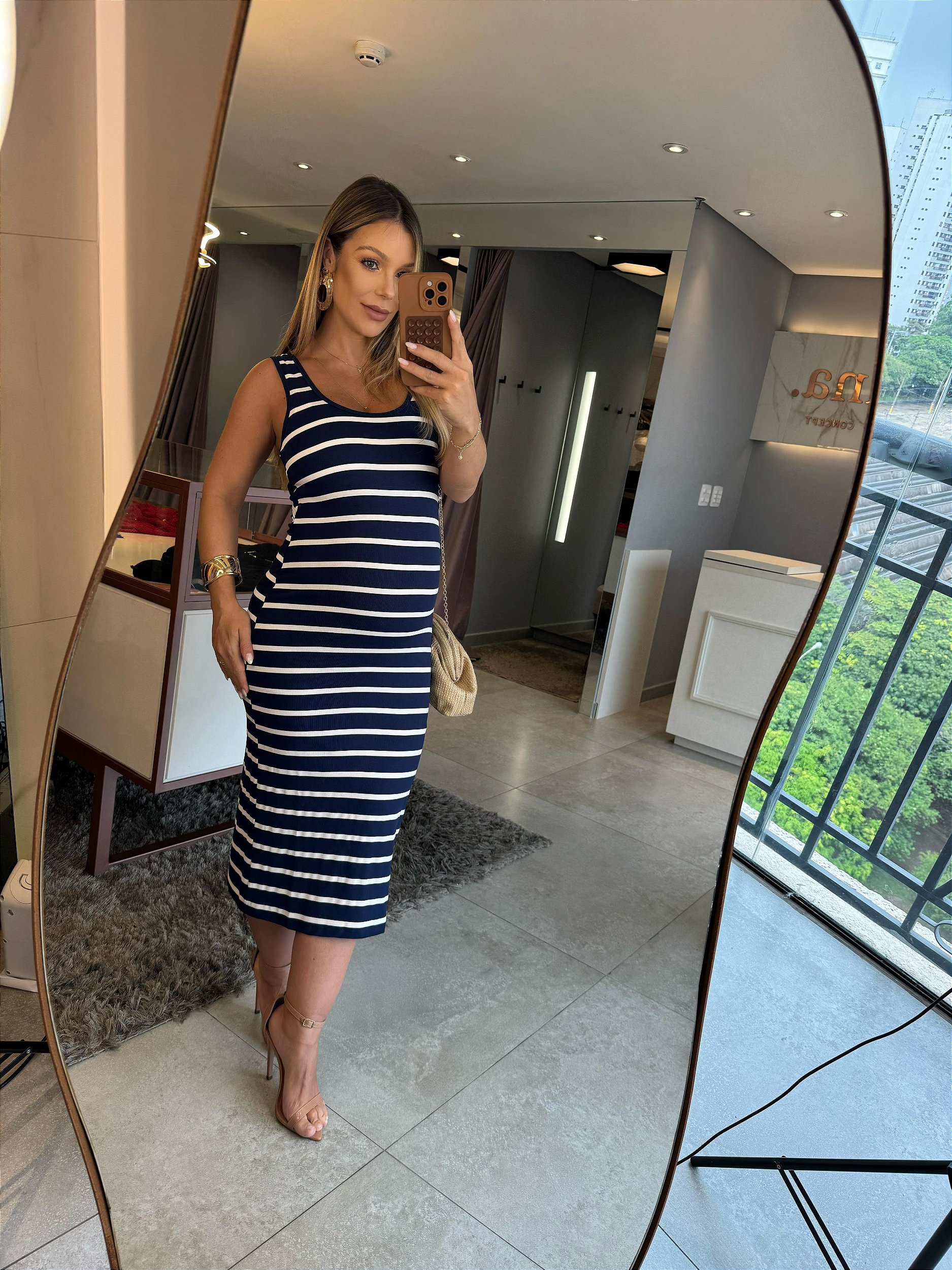 A estampa de listras horizontais traz um ar atemporal e contemporâneo, tornando o vestido extremamente versátil.