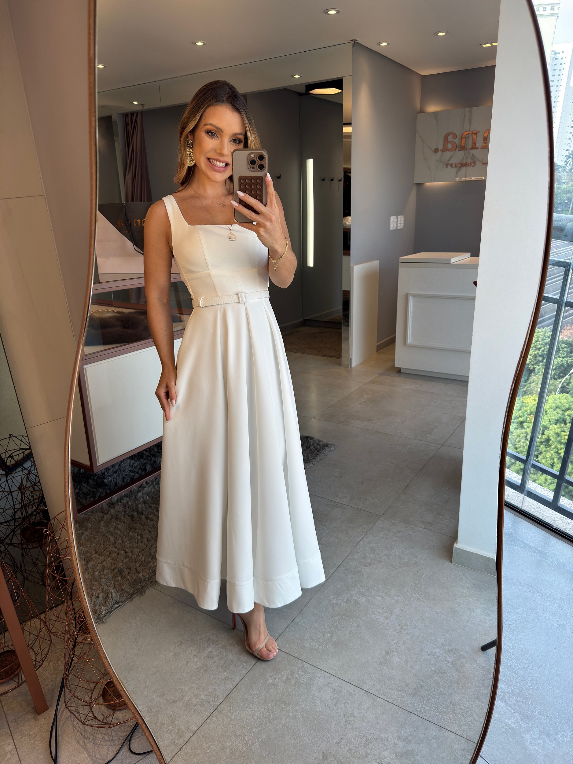 Descrição técnica: Vestido midi em crepe encorpado com alças largas e decote quadrado estruturado. A parte de trás traz um recorte cut-out arredondado e fechamento com botões forrados no alto das costas, além de zíper de metal centralizado. A saia evasê conta com acabamento em barra larga e fenda nas costas para maior fluidez.