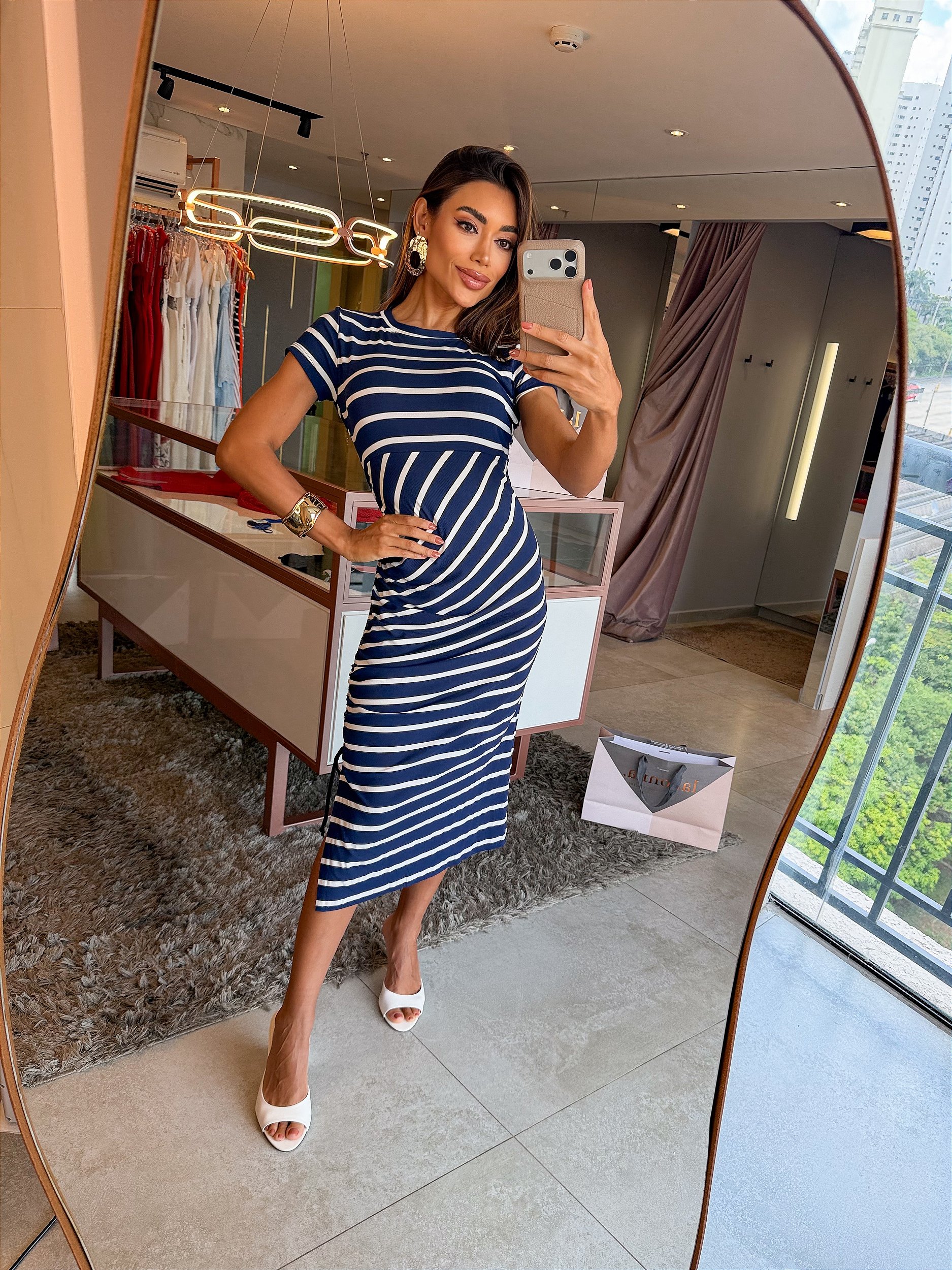 Confeccionado em tecido Stella Maris, conhecido pelo toque macio, elasticidade e excelente caimento, o vestido se adapta perfeitamente ao corpo sem marcar, garantindo conforto absoluto ao longo do dia. As listras  trazem um visual clássico e alongam a silhueta.