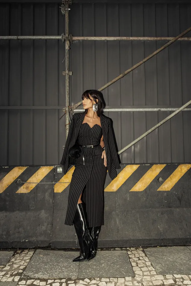 O vestido midi risca de giz da Labonna Concept traduz elegância, poder e sofisticação em uma única peça. Inspirado na alfaiataria clássica, o modelo traz uma proposta contemporânea e extremamente feminina, ideal para mulheres que gostam de um visual marcante e refinado.