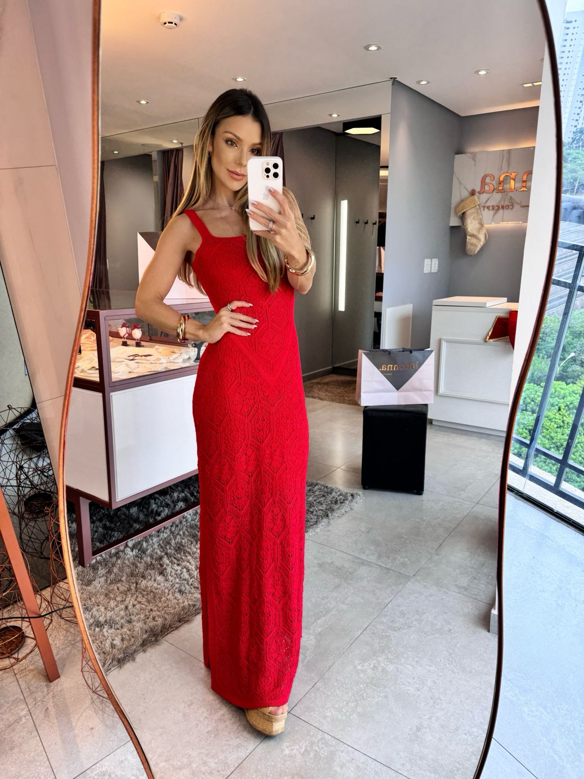 O modelo é um vestido lindo e cheio de charme , ajustado ao corpo, feito em tricot com uma linda trama e um detalhe de V invertido que desenha e afina a cintura.